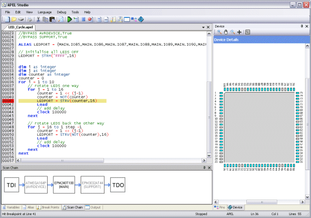 OPEN INT, "PROGRAM.HEX", DATAARRAY BUS ADDRESSBUS = {DEVICE1.IO30, DEVICE1.IO31 DEVICE1.IO32, DEVICE1.IO33 } BUS DATABUS = { DEVICE2.IO34, DEVICE2.IO35, DEVICE2.IO36, DEVICE2.IO37 } BUS WE = DEVICE1.IO38 FOR i = 1 TO LENGTH(DATAARRAY) ADDRESSBUS = STRV(i-1,4,OUTPUT) DATABUS = DATAARRAY[i-1] WE = "0" LOAD // PUT the address and data values on the PINS WE = "1" LOAD // Set WE high WE = "0" LOAD // Take it low again NEXT APEL can also be used to test boards in JTAG SAMPLE mode by writing scripts that test that inputs have changed (clocks are present and databuses are toggling), waiting for configuration pins to toggle etc. APEL allows variables, arrays and bus definitions and supports complex loops, functions, delays and conditional execution. The APEL Studio Script Editor provides breakpoints, single-step execution, Variable and Bus tracing and editing and device chain visualisation. Write your own custom test sequences, generate script automatically using the Script Wizard or use code provided by Atomic Programming. ActiveX Object script control allows full integration of software into the user's GUI, and a Console mode run scripts from command prompts. The APEL Player function means scripts can be compiled to be run at remote sites without having to release the source code.