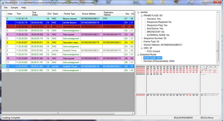 3) Packet sniffer - We had an issue using the Ubiqua sniffer recommended by NXP as Ubiqua does not support the MAC2003 security mode implemented in JenieJenNet. We do have an application that functions as a sniffer and uses the same USB Dongles and binaries that are used with Ubiqua as these are released as part of the NXP SDK. On non encrypted packet you will just see a list of bytes in the bottom right. On encrypted packets you will see two lists of bytes. The lower list is the decrypted data.