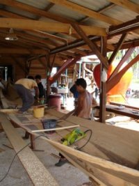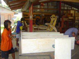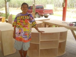 The boat was launched in the Khao Lak area and handed over to its new owner Mr Noppadon Sinto on 12/05/2006 The families are very proud of these beautiful boats and look forward to being able to go back to visit the area in the near future to track down their boats in operation. For more info on the fantastic work being carried out please visit: www.tsunamiboatproject.com 4. THAIKEA FURNITURE BUILDING PROJECT - TSUNAMI VOLUNTEER CENTRE When the families visited Khao Lak during Christmas 2005 they heard about other areas of work being undertaken by the Tsunami Volunteer Center (TVC) who set up the Cape Pakarang Boatyard. They were keen to help with these new projects. In March 2006 the fund sent a donation of £1000 to the TVC Thaikea furniture building project. This project allows villagers and volunteers to work side by side to meet the demand for furniture for the newly built homes in the villages and schools in the area. "Former fishermen and workers wanting to learn a new trade find the Thaikea project an environment to recognize and respond to the immediate and long-term needs of their own villages." The NATANDY donation was sufficient to fund the building of basic furniture for 20 new homes in Bang Kayah and the surrounding area. In April 2006 The TVC set up a new Thaikea workshop in Tung Wa, a 71 home community of Morgan people (Sea Gypsies) The fund donated a further £1000 to be put towards the purchase of the initial supply of 500 sheets of plywood out of which the furniture is constructed.